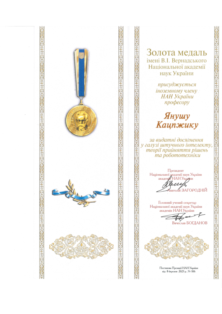 Z wielką radością przyjęliśmy wiadomość, że Profesor Janusz Kacprzyk otrzymał Złoty Medal im. V.I. Vernadskiego.
